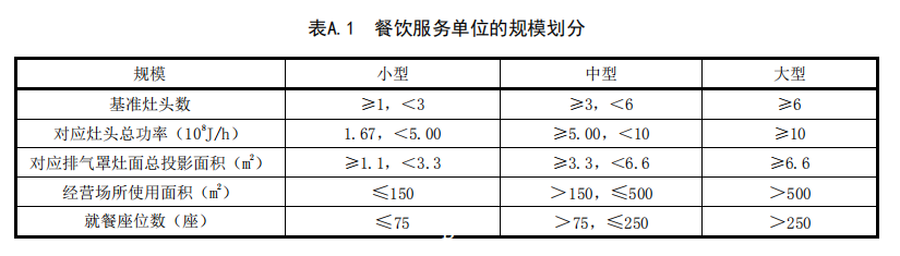 場所使用面積或就餐座位數(shù)折算。餐飲服務(wù)單位的規(guī)模劃分見表A.1,不同方式判斷規(guī)模不一致的,餐