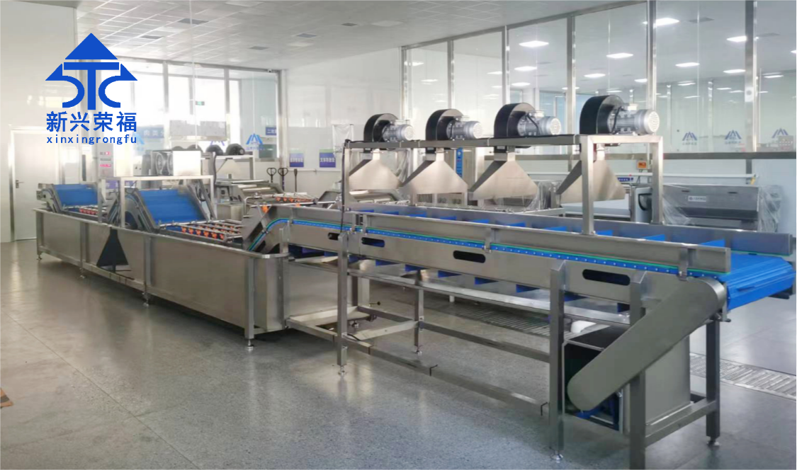 該項目采用的新興榮福蔬菜清洗線設(shè)備,包括含有六工位挑選輸送機(jī)、多功能切菜機(jī)、快速拆裝型提升機(jī)、水流式渦輪清洗機(jī)(高缸)、水流式渦輪清洗機(jī)(低缸)、震動瀝水機(jī)等。