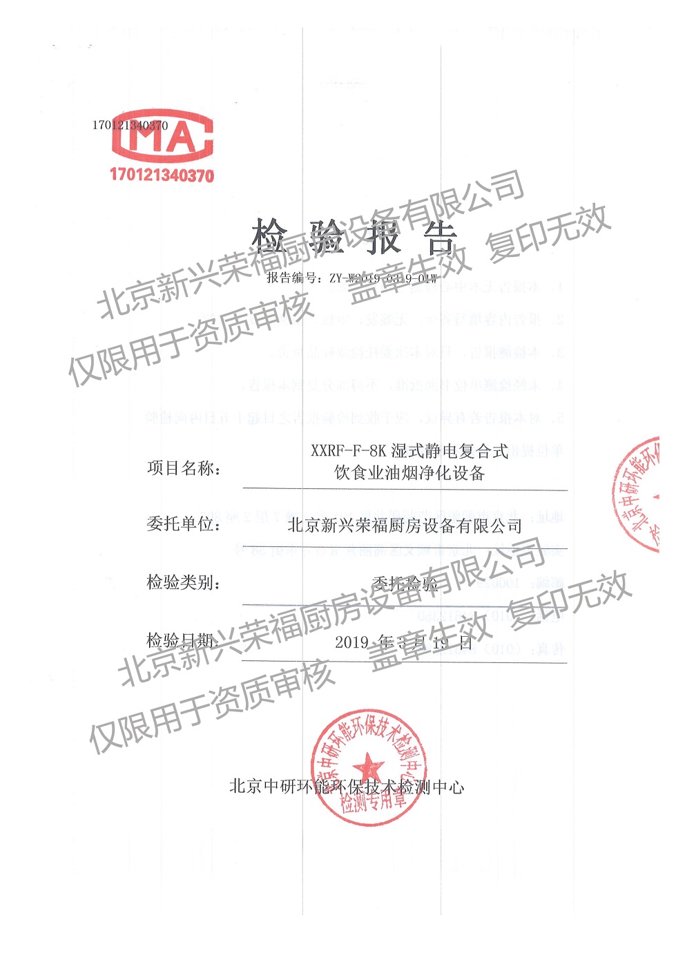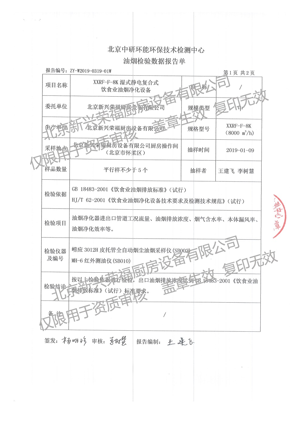 1、凈化率高達96%,優于DB11 1488北京地標-餐飲業大氣污染物排放標準。經實際使用和第三方檢測機構檢測結果如下:油煙濃度:0.38mg/m3;顆粒物濃度:1.20mg/m3;非甲烷總烴濃度:2.05mg/m。